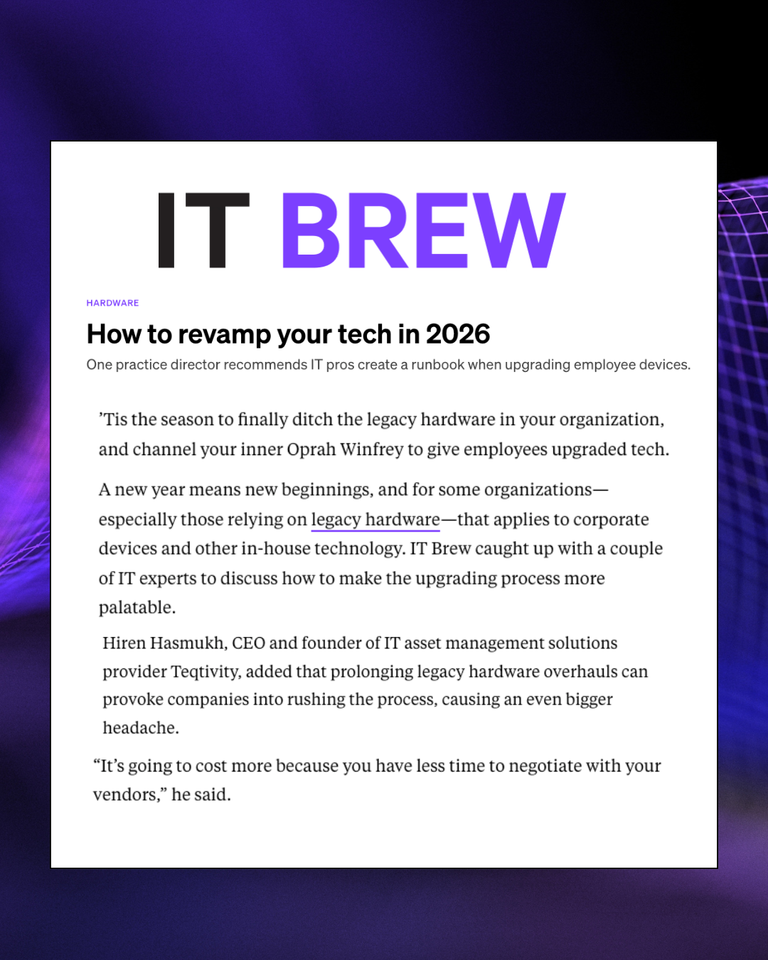 Teqtivity had a strong product, but their industry—IT asset management—wasn't exactly capturing media attention. They needed to break through in a crowded tech space and position their founder as a thought leader, not just another SaaS startup.
